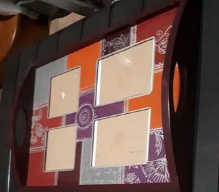 Vends plateau avec la particularite et l originalite d'y pouvoir insérer 4 photos de votre choix Tres bon état. Belle idee de cadeau. 12€ Envoi possible frais en sus.