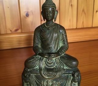 Statue de Bouddha en metal de couleur bronze. Cet objet de décoration présente Bouddha assis en posture de méditation, orné de motifs détaillés. Dimensions H 19,5 L 13 P 7 cm