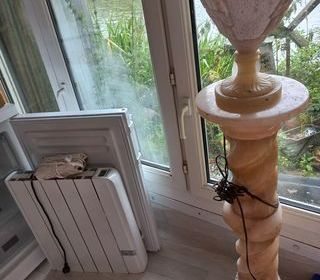 Lampe en albatre en forme de vase à décor de forme anthropomorphe reposant sur sa colonne sculptée torsadée et à décor de feuillage, repose sur une base carrée Epoque dernière moi