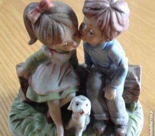 le bisou d'un petit garçon à une petite fille. Au pied un petit chien. Bon état