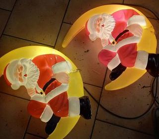 Vends deux boîtes à petites boules de Noël rouges jamais servi et et deux lunes avec fils électriques et une cloche de noël sur douille pour maison et jardin 2 lunes les 1
