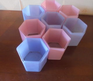 Ensemble composé de 8 récipients, en verre, de forme ocotogonale, verre épais, 4 bleues et 4 roses, pouvant s'utiliser individuellement, ou ensemble afin de former de jolies