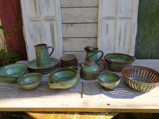 Service Céramique Poterie d'Art Grès Émaillé Vert L'ensemble en très bon état, travail artisanal de qualité, signature et atelier du potier à identifier. PAS D'ENVOI !!!