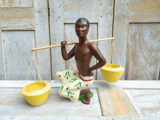 Statuette Africaine Porte Plante Céramique Vintage ca1950 Hauteur 31cm Bon état, un petit éclat sur le bord d'un panier