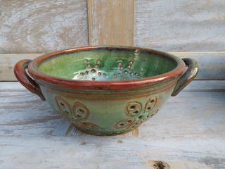Passoire Grès Émaillé Vert Porterie Artisanale Longueur 30cm (avec anses), largeur 23cm, hauteur 10cm Très bon état