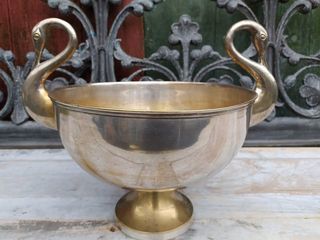 Vasque Champagne Rafraichissoir Métal Argenté Style Empire Anses Décor Cygnes Hauteur 33,5cm (au niveau des anses), largeur 40cm avec anses. Diamètre de la vasque 32cm. État