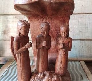 Sculpture Nativité Enfant Jésus Crèche Bois Sculpté Art Populaire Hauteur 28,5cm, largeur 17cm, profondeur 14cm. Très bon état, fissuration du bois sur la partie droite.