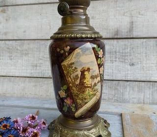 Ancienne Lampe à Pétrole en Faïence et Bronze Décor Moulin à Vent Hauteur 31,5cm, largeur corps 11cm, base 14,5cm. Très bon état général, la molette fonctionne mais la mèche