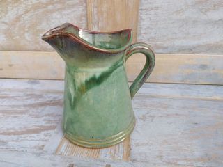 Pichet Grès Émaillé Vert Col Évasé Hauteur 17cm, dimensions bec à l'anse 13cm, base 13,5cm Très bon état