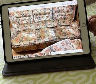 Vend canapé convertible en tissu couleur marron avec 2 fauteuils et 1 pouf