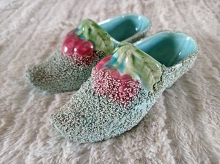 Paire de chaussons décoratifs en céramique, finition texturée avec des détails floraux en relief. Couleurs principales : vert, rose et turquoise. Excellent état