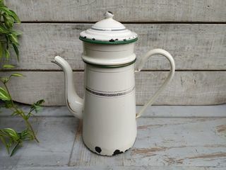 Ancienne Cafetière Émaillée Blanche à Liseré Gris et Bords Vert Hauteur 29,5cm, largeur 25cm. Présence de petits d'accidents et oxydation