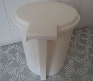 POUBELLE DE SALLE DE BAIN DE COULEUR BLANCHE. OUVERTURE AVEC UNE PEDALE. AUX DIMENSIONS DE 20 CENTIMETRES DE DIAMETRE PAR 22 CENTIMETRES DE HAUTEUR. AVEC A L'INTERIEUR AMOVIBLE