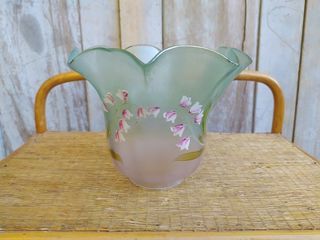 Grande Tulipe Verre de Lampe à Pétrole Corolle Verte Décor Fleurs Émaillées Hauteur 13cm, largeur corolle 15,5cm. diamètre extérieur base 5,8cm (intérieur 5,3cm). Bon état, Petit