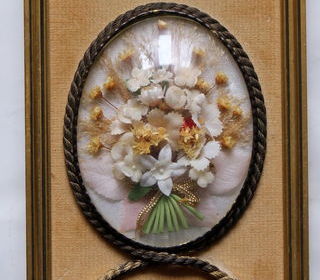Cadre Verre bombé avec fleurs immortelles et tissu 9.5 cm x 12 Cm verre bombé 22 cm x 15 cm cadre bois doré total TBE Envoi possible Rmp métro Corentin Celton