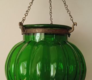 Très jolie lampe à suspendre en verre soufflé en laiton de couleur verte, complète. Cette suspension est un véritable objet utilitaire ou décoratif. Selon la puissance de l'ampou