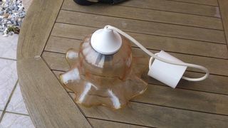 Suspension vintage en verre légèrement teinté en forme de fleur avec le cordon de fixation au plafond, l'ensemble est en bon état .