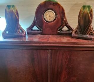 Pendule et ses deux vases en barbotine époque Art déco en très bon état. uniquement le mécanisme à changer.