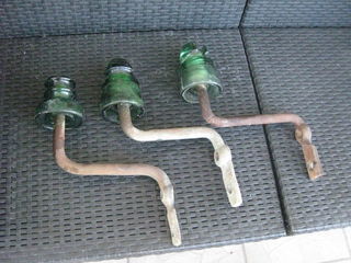 a vendre 3 isolateurs électriques en verre avec support en fer, idéal pour déco vintage pour servir de porte manteaux ou autres.Prix 10 epièce