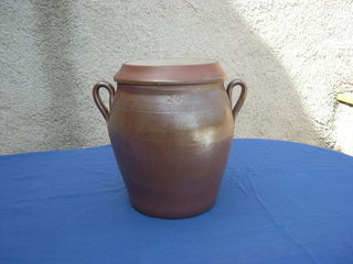 Poterie N.A. avec couvercle et 2 anses - capacité 20 litres - gravure d'un potier travaillant sous la marque N.A. - Hauteur avec couvercle : 40cm Hauteur sans couvercle : 36c