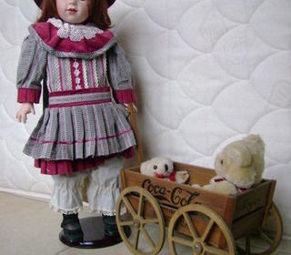 Poupée de porcelaine Megan 50cm Edition limitée Coca-Cola peinte à la main, chariot en bois avec ours en peluche à emporter