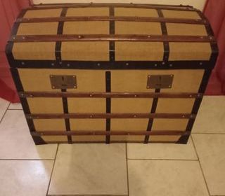 Vends coffre en bois ancien avec couvercle arrondi et ferrure de coin en cuivre. L'intérieur est entièrement capitonné, idéal pour entreposer des bouteilles! Dimensions L75cm et l4