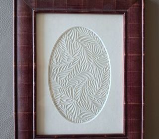 tableau décoratif cercle ovale blanc vegetalisé en relief encadrement en bois couleur bordeaux marque Emdé France il peut être posé ou accroché taille du cadre: 23x18 cm t