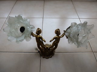1 Applique en laiton Macif avec chérubins Deux ampoules en verre façon fleur Jolie applique en laiton Macif avec deux chérubins Poids environ 2 kg Une fleur en verre en suppl