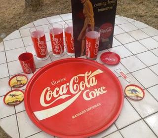 Divers objets Coca cola des années 70 Plateau, 4 grands verres, pot à crayons, décapsuleur,plaque pub métal,sous verres