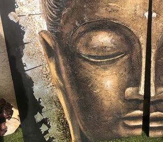 C'est un tableau de Bouddah de 1 m 20 sur 1 m 20 Peint sur toile cloué sur un cadre en bois Le tableau est en bon état Sa taille rend ce tableau très vivant et magnifique