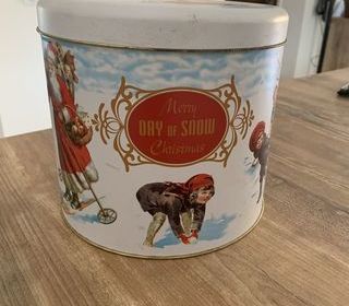 Vends Boite de rangement de Noël " Merry christmas day of snow " - Dimensions diamètre 21,5 cm hauteur 20 cm - Couleur multicolore - Très bon état -