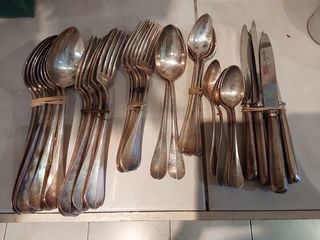 8 cuillères, 8 fourchettes et 6 petites cuillères poinçon 80 - 1269G 6 couteaux manches poinçon 18 : 406G 2 cuillères et 6 fourchettes poinçon 60 - 415G 6 cuillères mazagran poi
