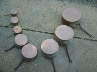 8 CASSEROLLES EN CUIVRE MASSIF ETAME ANCIENNE EPAISSEUR 3 mm QUEUE EN FONTE BARRE D'ACCROCHE de SUSPEND DE TOUTE LA SERIE FACTURE A L'APPUIE ( valeur d'origin