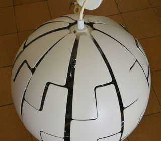 Lampe en forme de sphère blanche pouvant s'ouvrir et se refermer. Son diamètre est de 35,00 cm et peu éclairer avec des petites lampes Led, par vissage. Il faut tirer sur la ficell