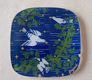 Crèche de Noël composée de figurines en céramique peintes, représentant la nativité, installée sur un décor en bois et carton avec fond étoilé et étoile. L'ensemble inclut plusieur