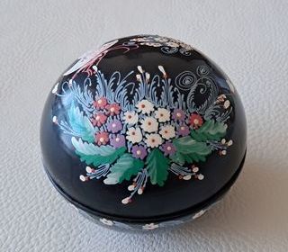 boîte en bois ronde laqué noir et peinte à la main décor fleur et papillon pas de rayures, éclat ou fissures hauteur 6 cm diamètre 8 cm