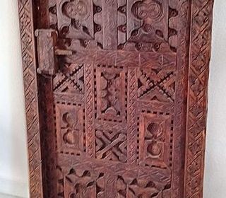 Très belle porte ancienne sculptée à la main, berbère du Maroc, artisanale. Belle antiquité ! Hauteur 117 cm / largeur 75 cm.