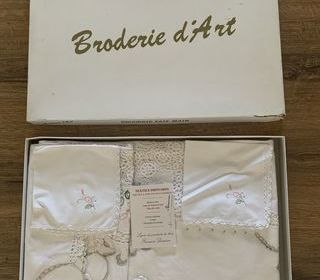 Vends Nappe + 12 serviettes anciennes broderie d' art " François Damien " - Broderie fait main - Dimensions 300 / 155 cm - Couleur blanc - Trè