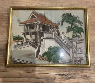 tableau représentant l'image d'une poulette derrière un grillage. cadre bois clair + vitre dim : 32x28 cm