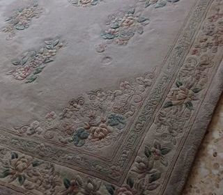 Magnifique tapis rectangulaire, très epais, dans les tons roses. Dimensions 2 m X 3,34 m dont 13 cm de franges a chaque extrémité.