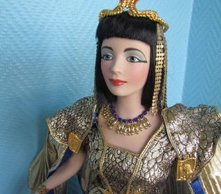 poupée Cléopâtre reine du Nil par franklin heirloom dolls , peinte a la main, la tété , les épaules et les jambes, de porcellane fine , Elle est vêtue d 'une robe de cérémonie bleu
