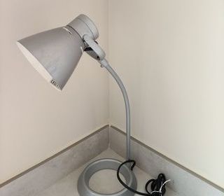 Je vends cette lampe de bureau de 40 cm, avec tête orientable, en métal de couleur gris argent. Idéale pour votre espace de travail ou bureau étudiant. Taille compacte : 40 cm