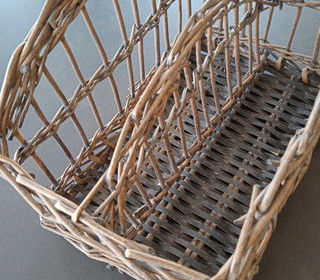 Panier porte documents en osier/rotin.couleur beige/marron/gris. Dimensions : Largeur 27cm, profondeur 18cm, hauteur max 16,5cm. En bon état (juste un tout petit bout cassé sur l