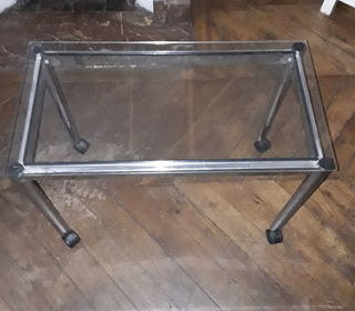 CONSOLE PLATEAU VERRE EPAISSEUR 5 MM LONGUEUR 76 CM LARGEUR 40 CM HAUTEUR 55 CM ROULETES INOX TRE BON ETAT REMIS ENMAIN PROPRE PAYE EN ESPECES