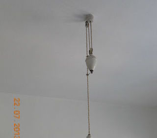PLAFONNIER LUSTRE "MONTE et BAISSE" - SUSPENSION ANCIENNE des années 1940 en porcelaine, système de contrepoids également en porcelaine et laiton, - Abat-jour à bord festonné, opa