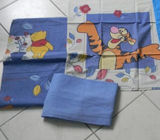 PARURE DE COUETTE WINNIE L'OURSON, bon état, comprenant : 1 housse de couette pour lit 90*190 ; 1 taie d'oreiller 60*60 1 drap housse 90*190 La parure est au prix de 10€ hors f