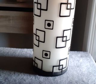 Vase blanc avec motifs carrés en relief dessus. Hauteur: 20cm, diamètre: 9,5cm. Etat neuf.