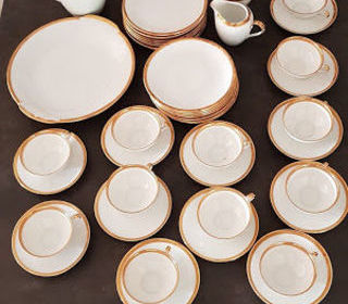 très beau service blanc et or comportant: verseuse 12 assiettes à dessert 12 tasses et sous tasses sucrier plat à tarte service en porcelaine ;excellent état