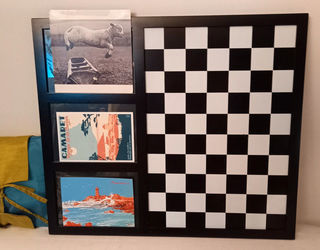 Cadre : - A gauche avec possibilité d'insérer trois photos. - A droite, une partie échiquier aimantée noir et blanc avec quatre aimants : trois blancs et un noir