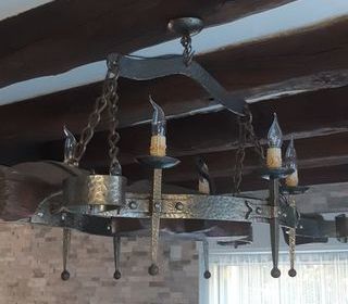 Lustre ancien en fer forgé, volutes et dents de herse monté sur un joug a boeuf